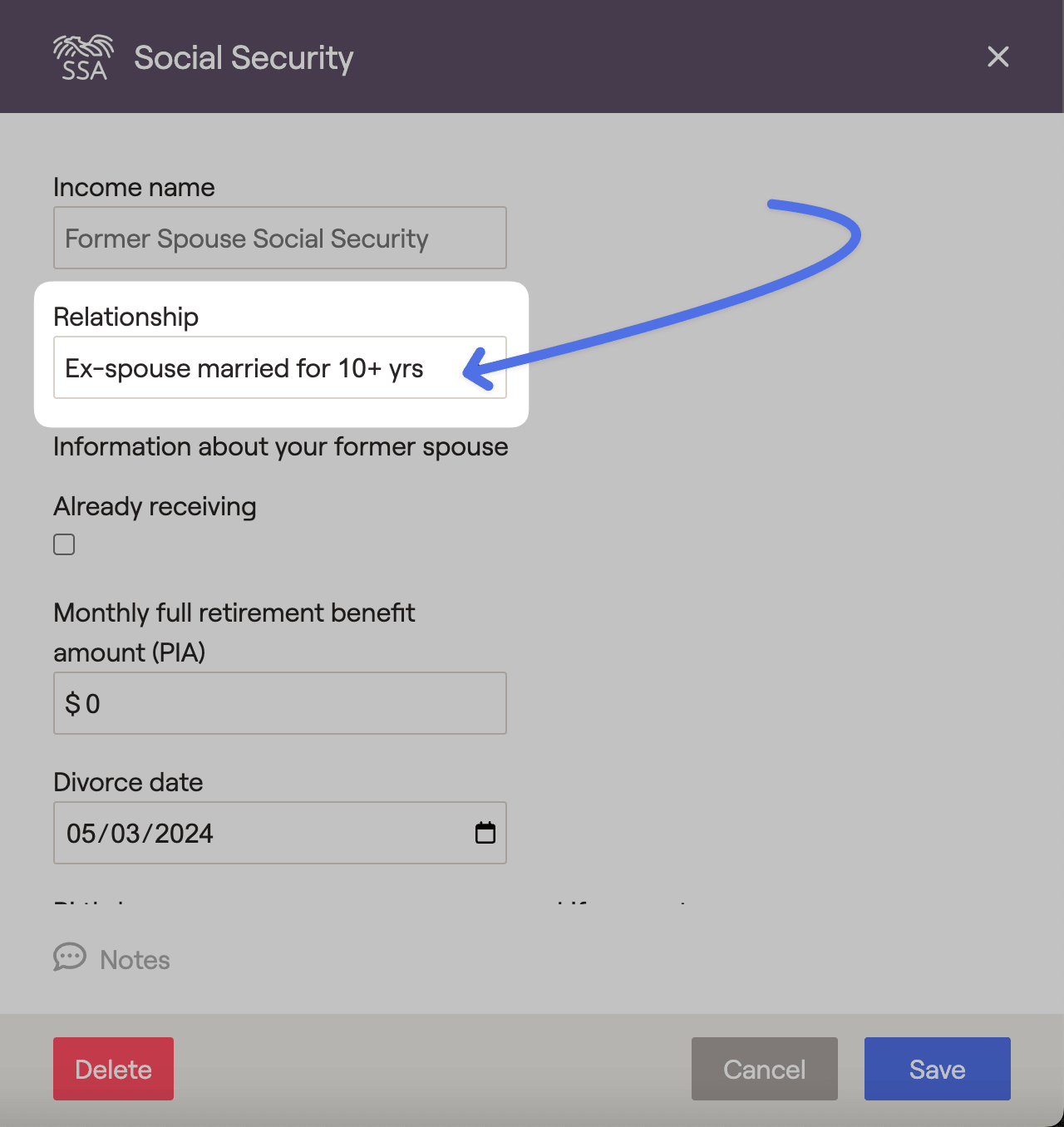 Clients may be entitled to a spousal benefit based on the earnings record of their previous spouse after being married for ten or more years. The Divorced Spouse benefit is based on half of the ex-spouse’s full retirement benefit (PIA). If that amount exceeds the client’s own retirement benefit, the client will receive the difference as a spousal benefit. Select ‘Ex-spouse married for 10+ yrs’ within the Relationship field to reflect a benefit from a divorced spouse: