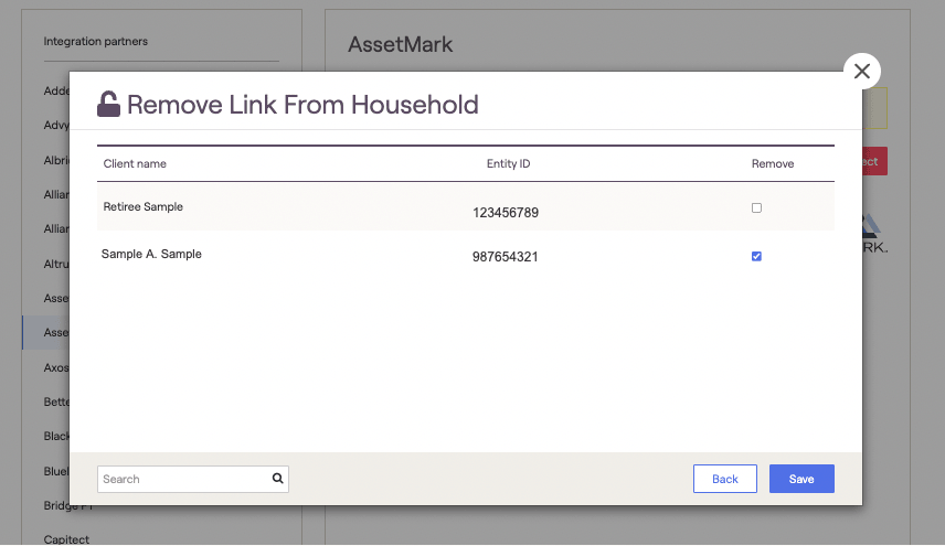 Once selected users will see a popup window with the client's name, entity ID, and the option to remove the integrated data by clicking the checkbox to the right. Once checked, click save to remove linked data from the client plan in RightCapital.