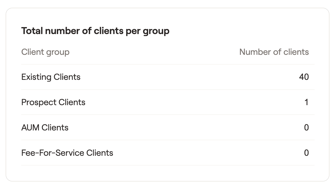 Within the Advisor Portal > RightIntel > Dashboard tab, the total number of clients per group list will detail the number of clients found within each client group. Client groups can be created or adjusted within the Advisor Portal > Gear Icon > Client Settings > Client Groups tab. Click here for more information.