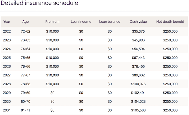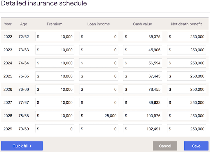 Users can then fill out the necessary details to show death benefits, premiums, fees and cash value distributions within the future cash flows.