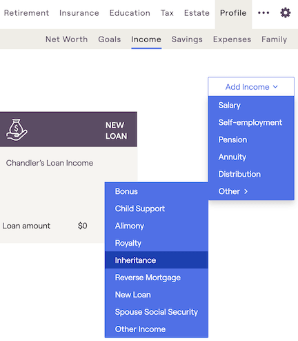 Visit the Profile > Net Worth > Income tab > click Blue 'Add Income' button > select inheritance