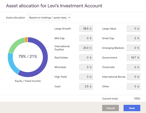 - Based on holdings / asset class: Only available when the Entry method is set to “Enter holdings / asset class”. In this case RightCapital will calculate the asset allocation based on the holdings or asset classes that are entered or linked to the account.