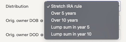 If an inherited “401(k) and traditional IRA” or “Roth 401(k) and Roth IRA” is added as income we will ask for the original owner DOB and Distribution type. We assume any such inherited assets are from a non-spouse, and all distributions will work the same as for inherited IRA assets.