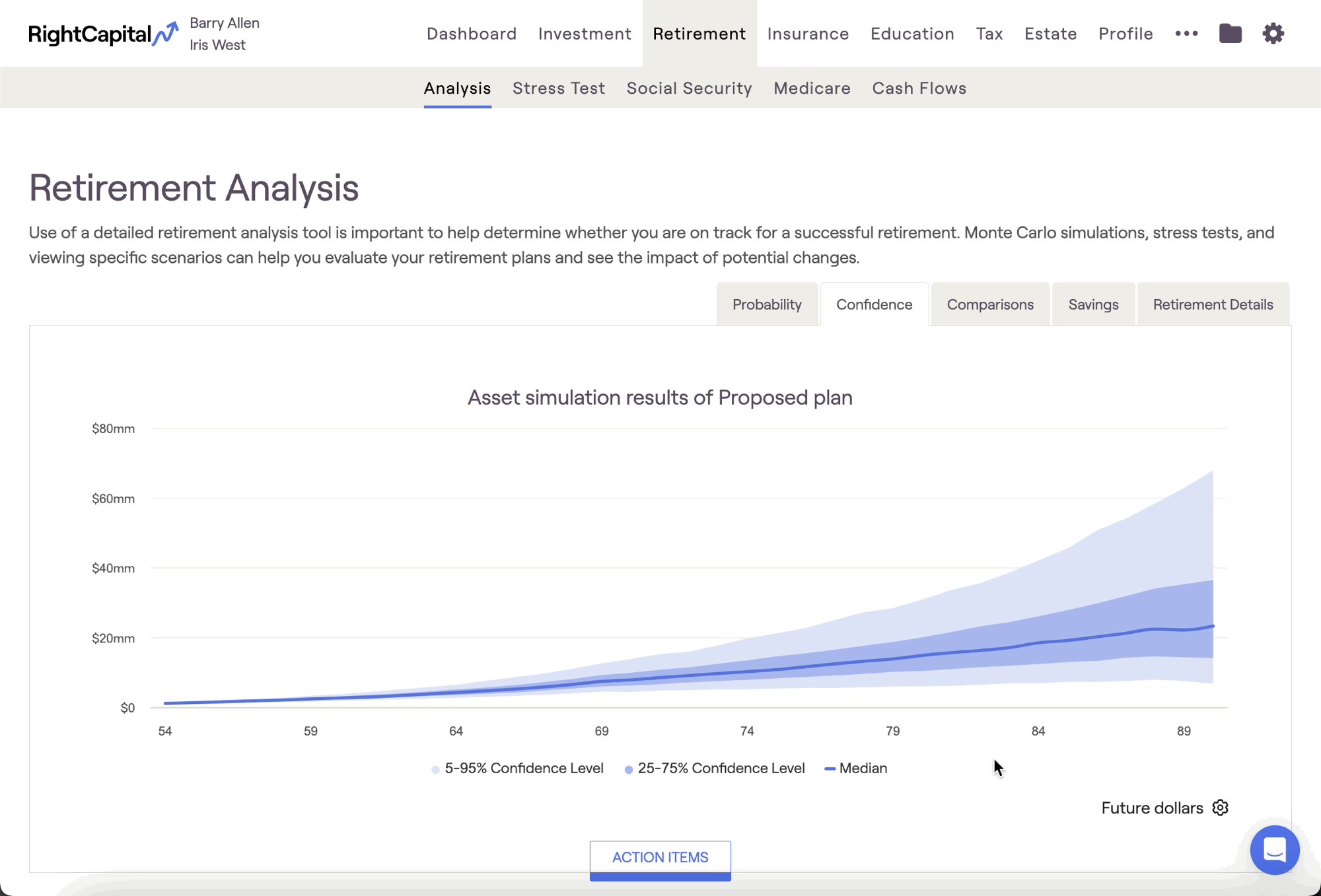 Many clients often latch onto the median value as their expected retirement value at any given point. However, at best, this only has a 1/1,000 chance of being exactly true! Some successful advisors carefully disclose both the reality of a simulation ("we can't know the future until we're there") and the reality of probable range over exact value.