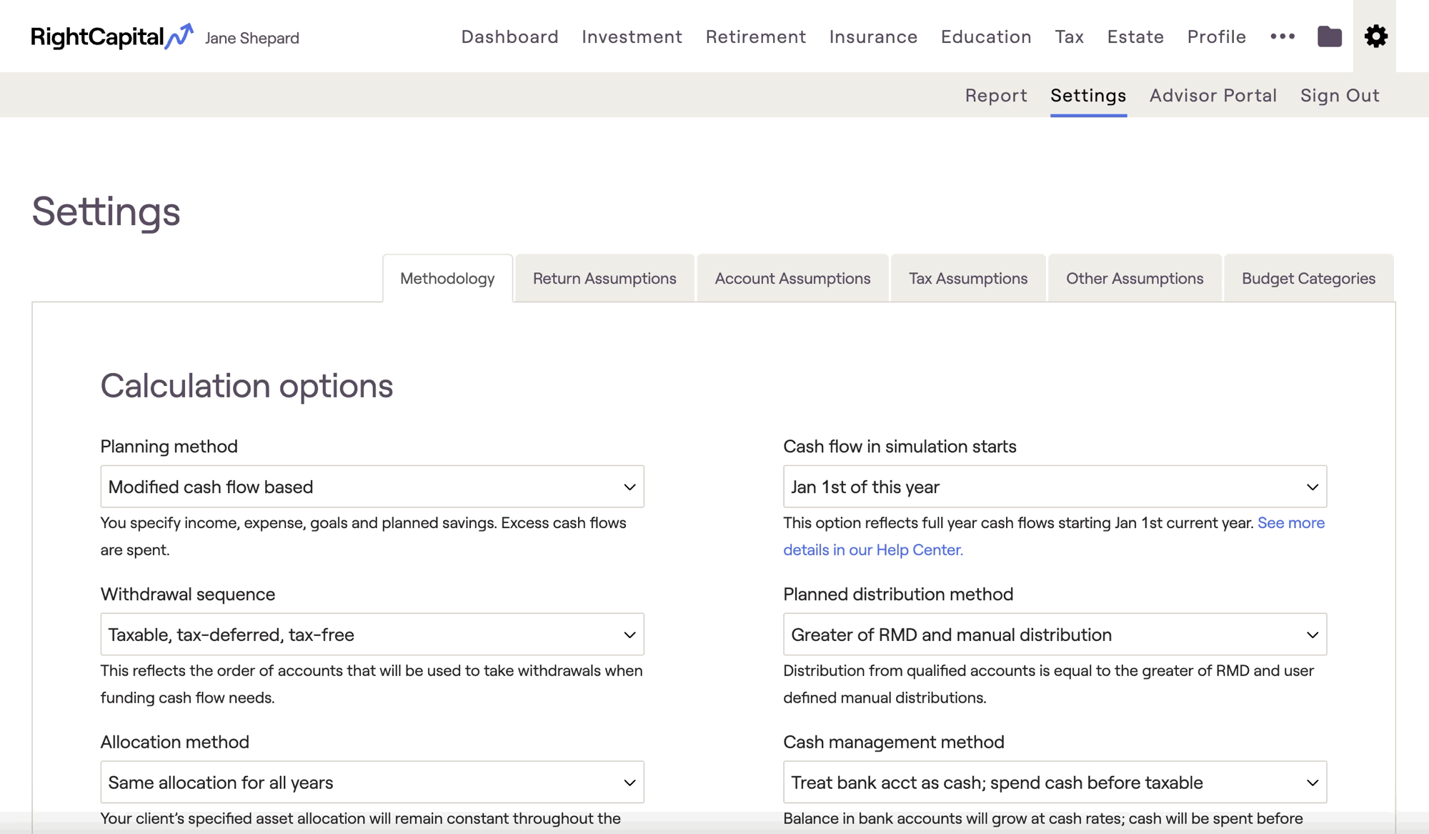 The Gear Icon > Settings > Methodology tab enables you to adjust settings on a client-by-client basis, impacting only the household you are currently working on. You can adjust the global presets for these same settings within your Advisor Portal, by navigating to the Client Settings > Client Presets tab.