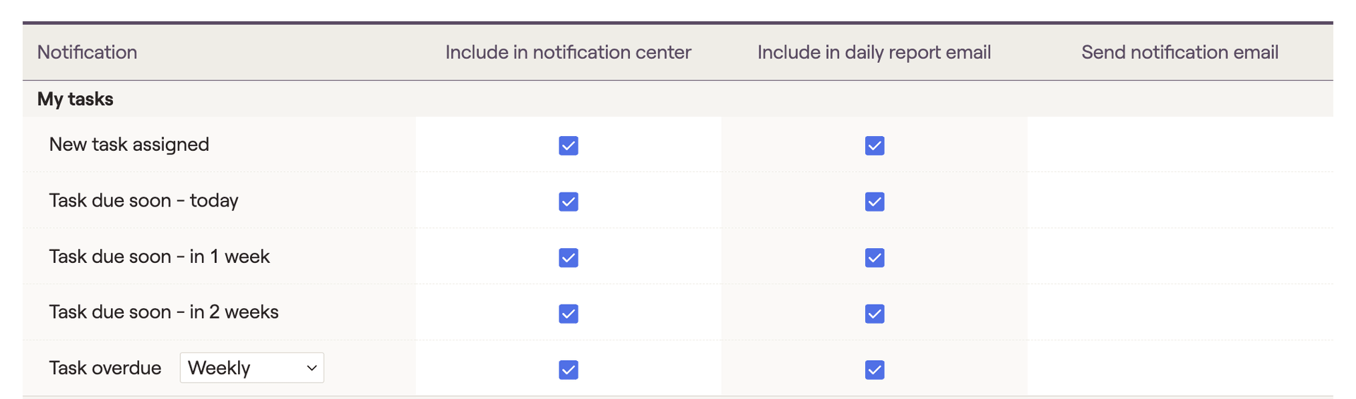 My tasks notifications are received when tasks are initially assigned to you, when your tasks are due soon, and when your tasks are overdue. You can choose the frequency of notifications for both upcoming tasks (due today, in 1 week, and in 2 weeks) as well as overdue tasks (weekly or monthly):