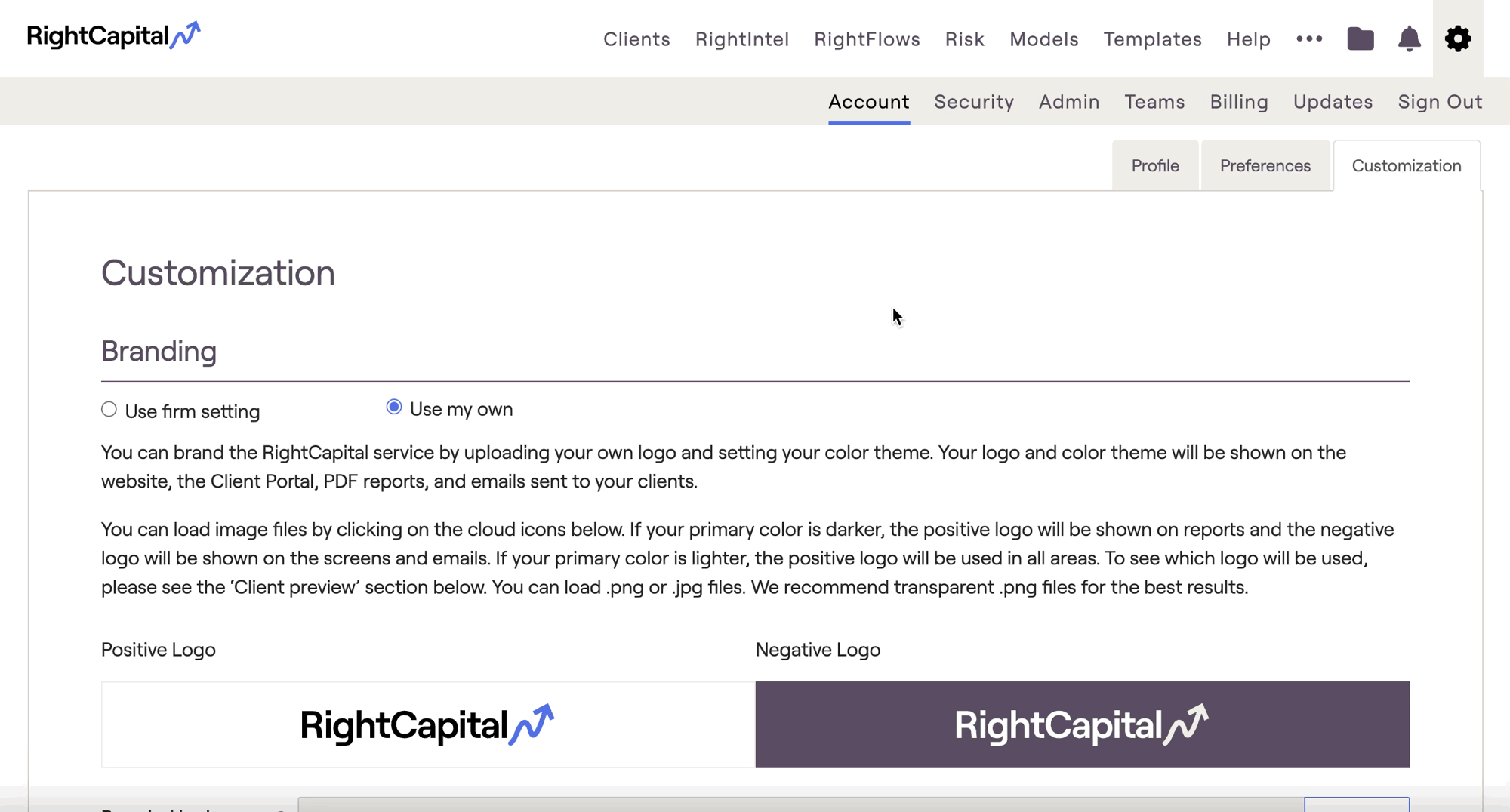 To access these customization settings, navigate to Gear Icon > Account > Customization tab of the Advisor Portal: