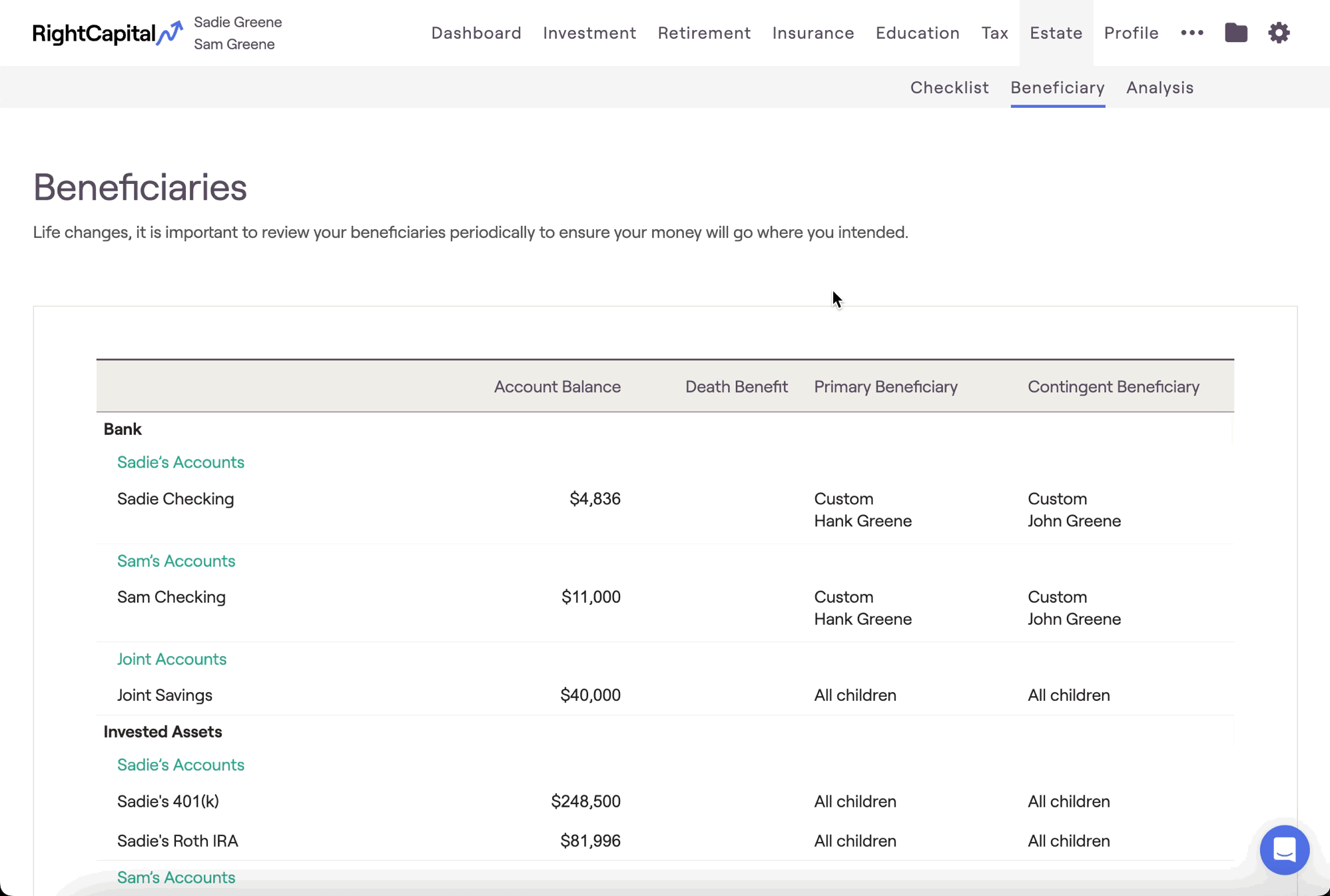 - A Beneficiary page where clients can list the primary and contingent beneficiaries for all of the accounts within their financial plan