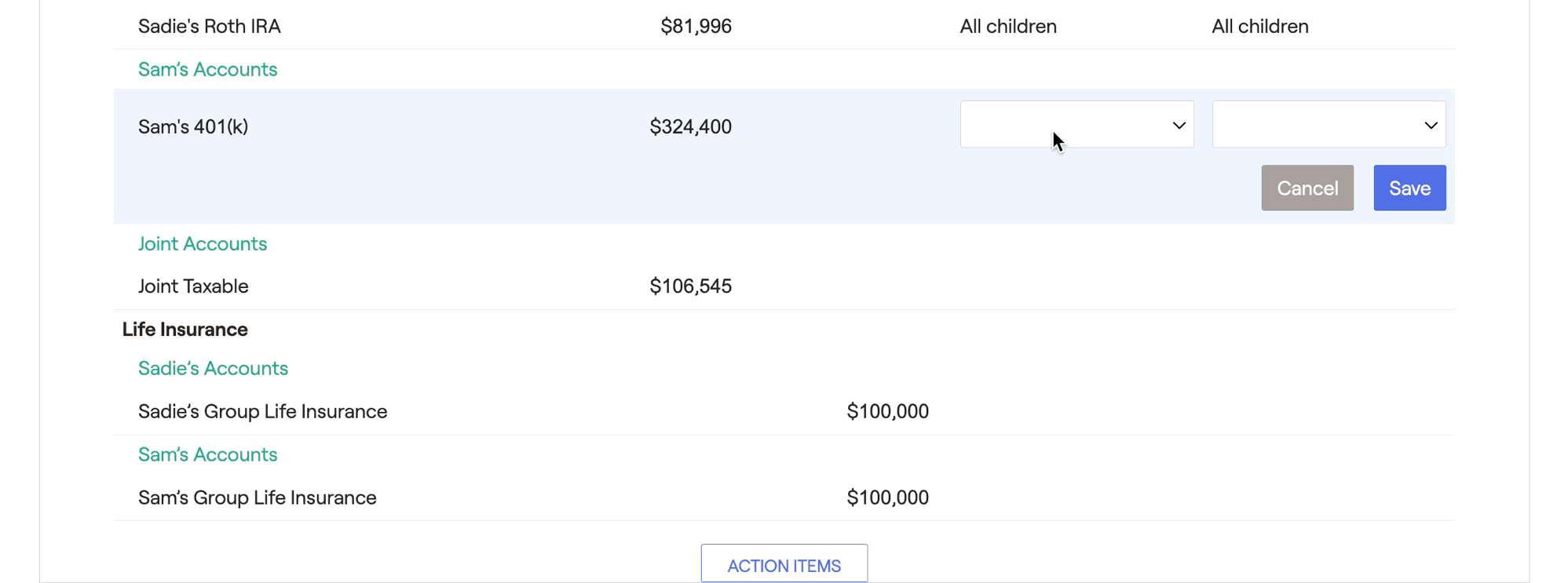 When a beneficiary has been assigned, click on that asset and choose a beneficiary from the dropdown menu: