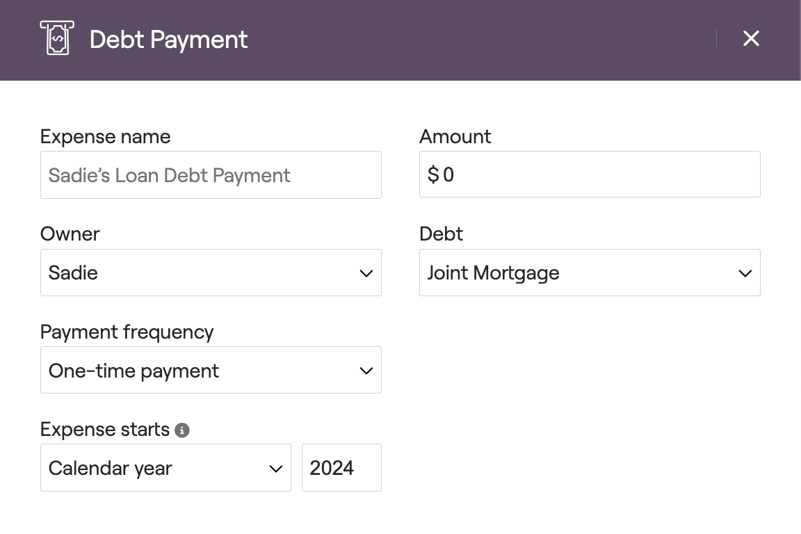 Expense ends - The end year is the final year the expense is included in the plan. If the Payment frequency is set to One-time payment, this field will be hidden.