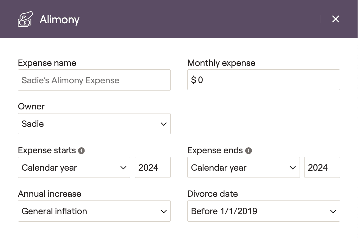 Alimony expenses can be added to a client plan by clicking Add Expense > Alimony: