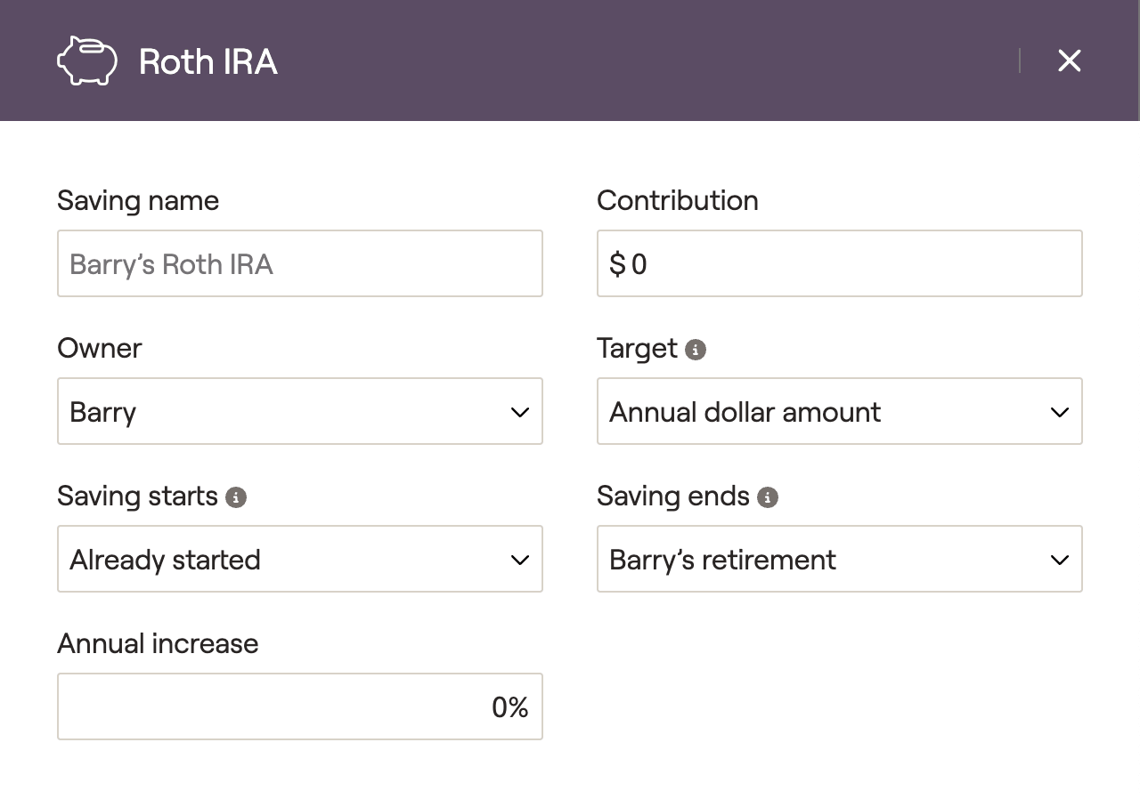 Start by choosing either a client or outside individual as the Owner. Depending on your chosen Target option, enter the client's Contribution as an annual dollar amount or percentage of income. Lastly, dial in the Saving starts and Saving ends dates to determine the duration of the contributions. If you have 'Annual dollar amount' chosen as your target you can enter an optional Annual Increase.