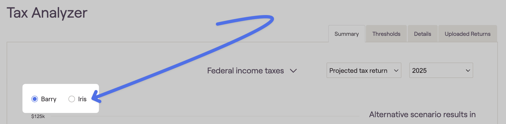 For clients that are married filing separately or non-married filing single, radio buttons in the upper left will allow you to switch between each's clients information. As a reminder, you can change a plan's tax filing status within the Profile > Expenses > Taxes and Fees card: